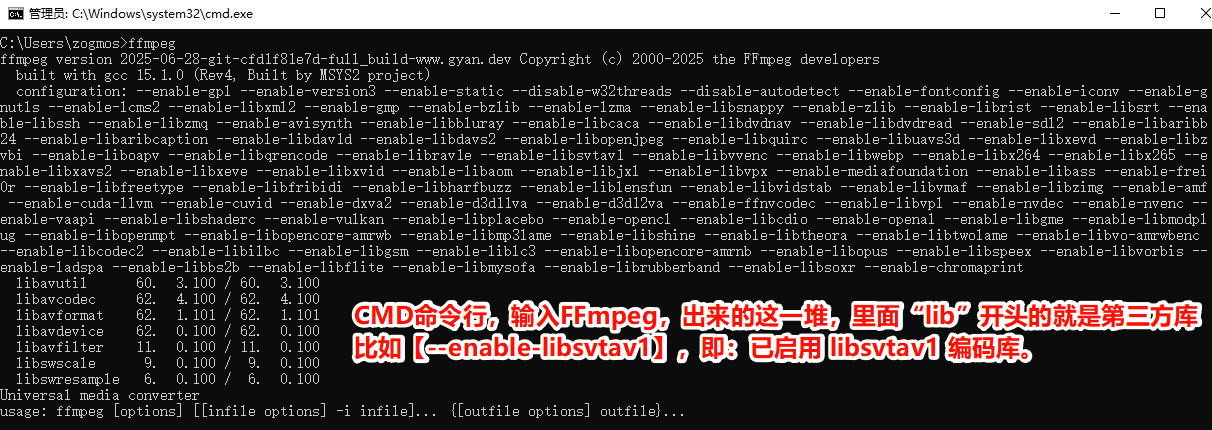 但是FFmpeg没有软件界面,只是一个CMD命令行工具。