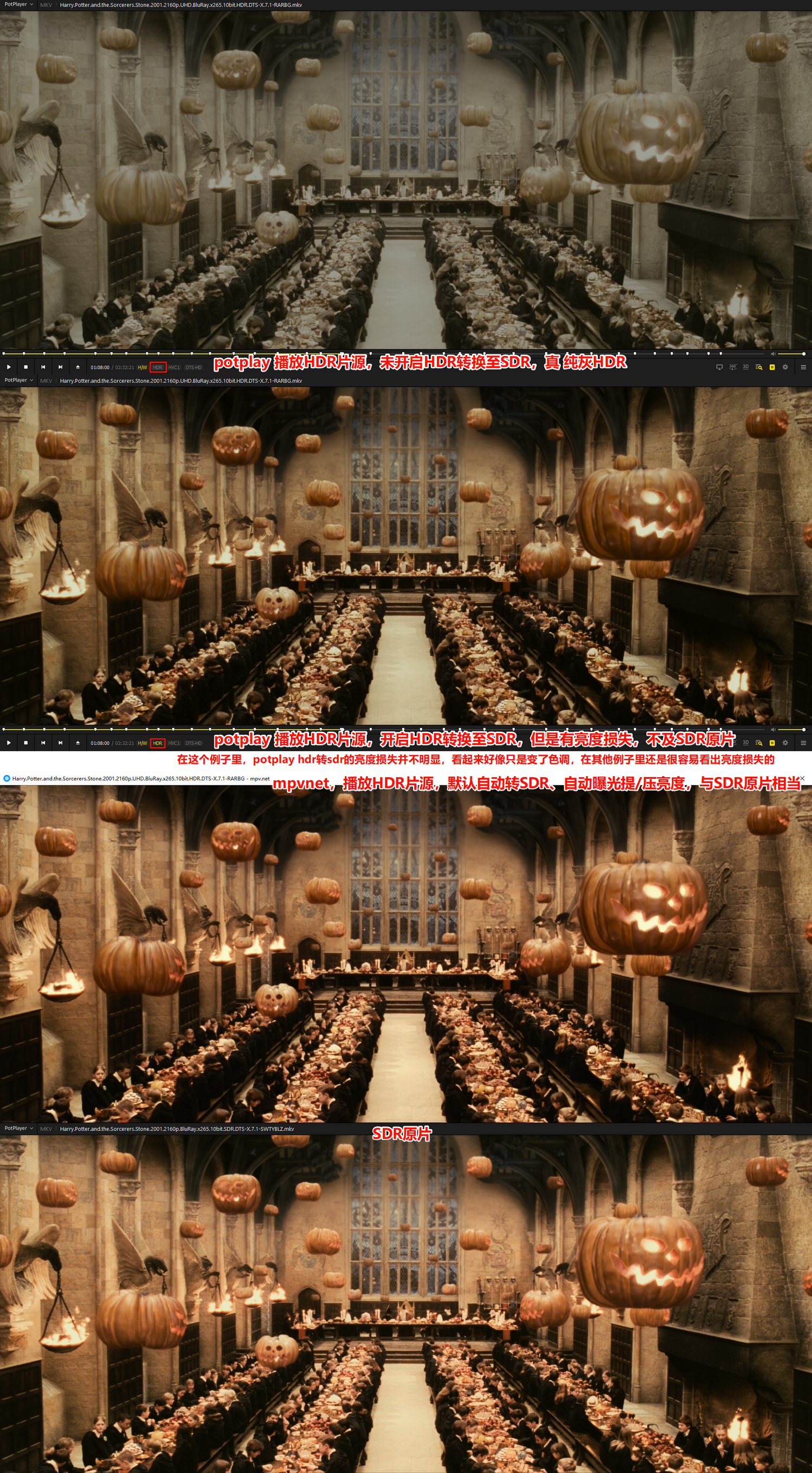 mpvnet的情况不错,亮度接近SDR原片,但是…这就相当于在看SDR,而不是HDR了,那为什么下载HDR片源,而不是下旁边的SDR片源,确保一定没有亮度损失呢?