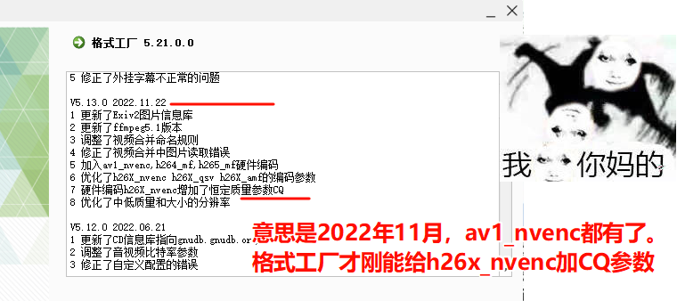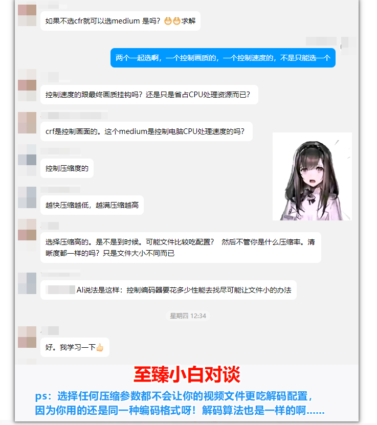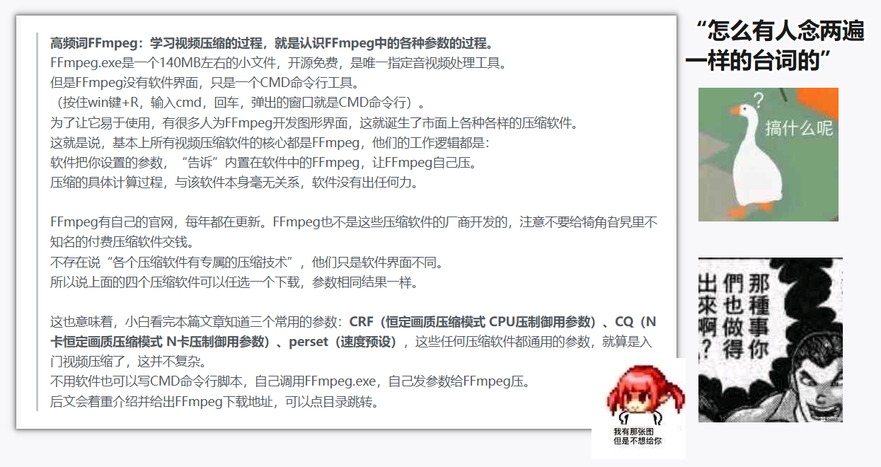 所以说上面的四个压缩软件可以任选一个下载,参数相同结果一样。这也意味着,小白看完本篇文章知道三个常用的参数:CRF(恒定画质压缩模式 CPU压制御用参数)、CQ(N卡恒定画质压缩模式 N卡压制御用参数)、perset(速度预设),这些任何压缩软件都通用的参数,就算是入门视频压缩了,这并不复杂。
