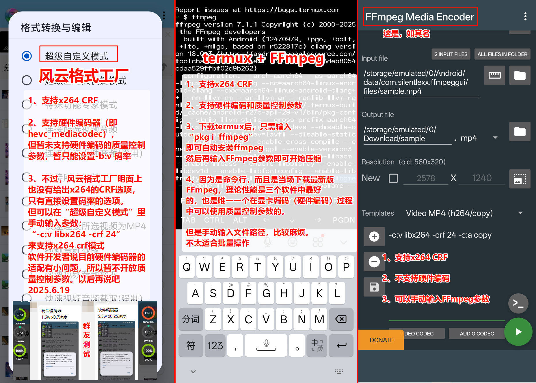 GPU硬编:有风云格式工厂和termux。但前者只能固定码率压缩。